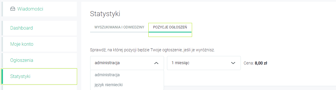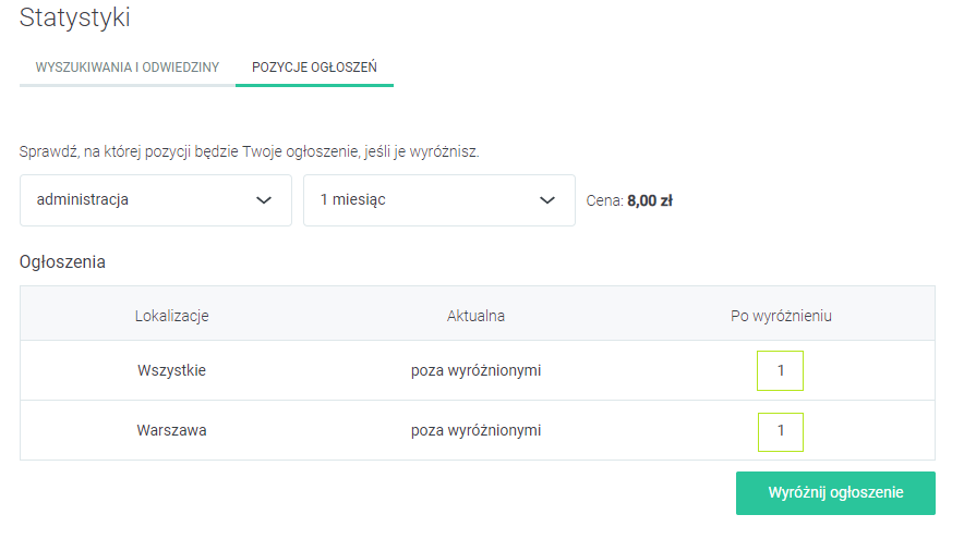 Żeby móc skorzystać z tego prostego kalkulatora do przeliczania pozycji ogłoszenia w zależności od ilości zakupionego wyróżnienia, na swoim koncie musicie posiadać aktywną opcję „Statystyki”. Macie już?