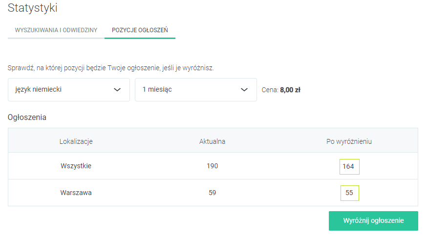 Jak widać, zakup wyróżnienia na okres 1 miesiąca dla przedmiotu „język niemiecki” nie zmieni drastycznie pozycji naszego korepetytora.