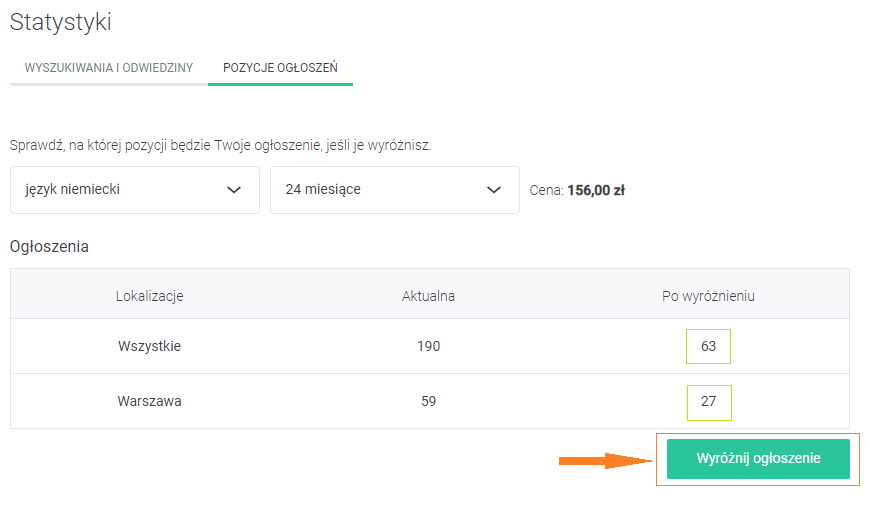 Określenie liczby punktów wyróżnienia potrzebnych do osiągnięcia konkretnej pozycji na liście nie było jeszcze takie proste. Z pomocą przychodzi Wam dostępna w Waszych kontach opcja „Statystyki”. Dzięki niej nie tylko dowiecie się jaka liczba osób odwiedziła Wasze ogłoszenie czy wyświetliła numer telefonu. Tu również sprawdzicie aktualną pozycję swoich wszystkich ogłoszeń.