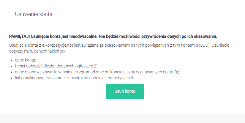 Usunięcie konta oraz wszelkich danych osobowych jest nieodwracalne. Oznacza to brak możliwości przywrócenia usuniętych danych.