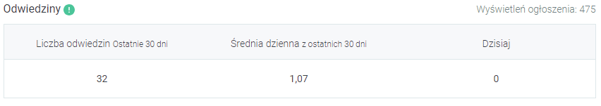 - odwiedziny – w tej części poświęconej odwiedzinom znajdziesz informację, ile razy ktoś odwiedził podstronę z Twoim ogłoszeniem. Dane tu prezentowane są na podstawie ostatnich 30 dni, średniej dziennej z 30 dni i z dnia obecnego.