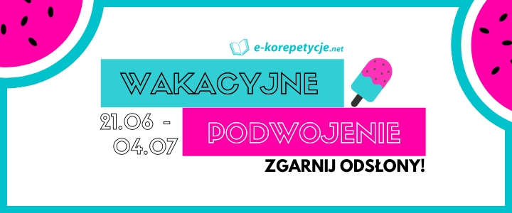 Prowadzisz kursy wakacyjne, kolonie, albo przygotowujesz do egzaminów poprawkowych? Daj o sobie znać wykupując kampanię bannerową w naszym serwisie, a dodatkowo otrzymasz 100% odsłon gratis! Wystarczy, że w okresie od 21.06 do 4.07.2021 zamówisz kampanię bannerową na dowolną ilość odsłon wpisując w tytule kampanii "100% w wakacje", a my podwoimy tę ilość całkowicie za darmo!