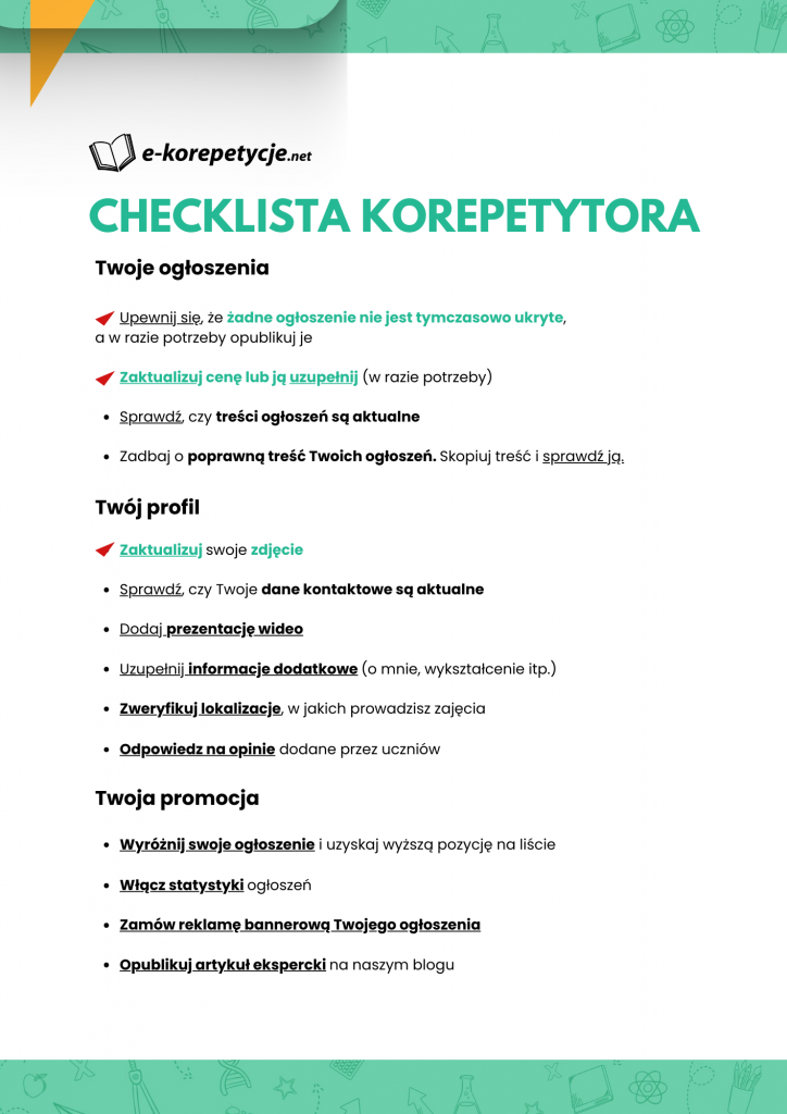 Nowy rok przywitał nas samymi nowościami. Ostatnio przekazaliśmy w Twoje ręce inteligentny notatnik z zajęć, a dziś podsyłamy noworoczną checklistę korepetytora, gdzie zachęcamy do aktualizowania danych na koncie.