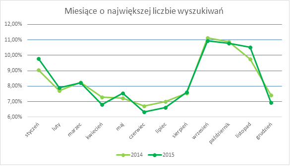 Nie da się ukryć, że rynek korepetycji - zarówno po stronie popytu, jak i podaży - wykazuje sezonowość. Na wykresie poniżej wyraźnie widać, w jakich miesiącach osoby szukające korepetycji najczęściej przeglądają ogłoszenia. Najwyższy poziom wyszukiwania zawsze przypada na początek roku szkolnego, czyli wrzesień-listopad. W samym wrześniu i październiku 2015 r. liczba wyszukiwanych przedmiotów osiągnęła ponad 22% wszystkich wyszukiwań w całym roku. Drugim popularnym okresem na poszukiwanie korepetycji jest początek drugiego semestru szkolnego, czyli styczeń (9,05%).