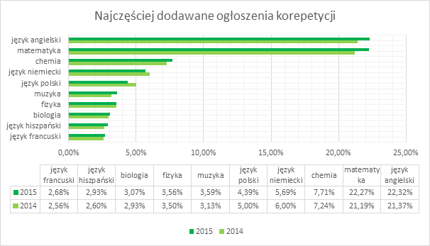 Jak wynika z powyższego wykresu, pod względem liczby ogłoszeń w serwisie, język angielski i matematyka dominują nad resztą przedmiotów. Ogłoszenia tylko z tych dwóch przedmiotów stanowią niemalże połowę wszystkich ogłoszeń w serwisie (44,59%). Co więcej, ich liczba z roku na rok rośnie. Natomiast spadek udziału w ogólnej liczbie ogłoszeń zanotował w 2015 roku język polski oraz niemiecki. Co ciekawe, na wysokich pozycjach zarówno ogłoszeń, jak i popularności wyszukiwania, jest muzyka.