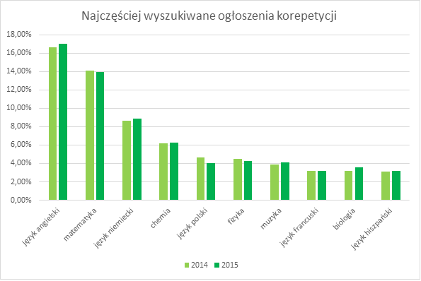 Z analizy danych z serwisu wynika, że najczęściej uczniowie wyszukują ogłoszeń z języka angielskiego, matematyki, niemieckiego i chemii. Ta czwórka od lat zajmuje czołowe pozycje na liście przedmiotów najczęściej wyszukiwanych przez uczniów. Porównując lata 2014-2015 popularność języków angielskiego i niemieckiego rośnie, natomiast matematyka była wyszukiwana r. Wyraźnie mniejszą popularność w 2015 roku miały też ogłoszenia z języka polskiego - pod tym względem lepsze w 2015 roku były ogłoszenia z fizyki i muzyki.