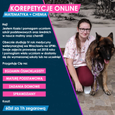 Hej! Nazywam się Kasia, jestem studentką 4. roku medycyny weterynaryjnej. Udzielam już od 7 lat korepetycji z matematyki oraz chemii. Prowadzę zajęcia dla uczniów szkół podstawowych i średnich. Przygotowuję do egzaminu osmoklasisty oraz do matury, a także pomagam przygotować się do sprawdzianów i kartkówek :) stawiam na zrozumienie danego zagadnienia zamiast na wykucie się go na pamięć. Uczę w praktyce - na konkretnych zadaniach. Serdecznie zapraszam do kontaktu 😊