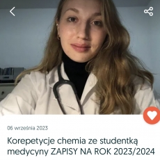 [Ostatnie miejsca na rok 2023/2024!] Cześć, nazywam się Martyna i jestem studentką medycyny - kierunek lekarski. Jeśli Twoim marzeniem jest dostanie się na medycynę, stomatologię, farmację lub podszkolić swoją wiedzę w zakresie chemii - nie trać ani chwili! Zgłoś się do mnie:)