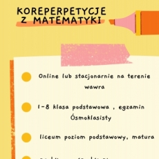 witam, serdecznie zapraszam na korepetycji z matematyki na poziomie szkoły podstawowej. Chętnie pomogę przygotować do egzaminu 8-klasisty z użyciem skutecznych metod i najnowszych materiałów. Potrafię w jasny, prosty i przystępny sposób wytłumaczyć materiał każdemu uczniowi.